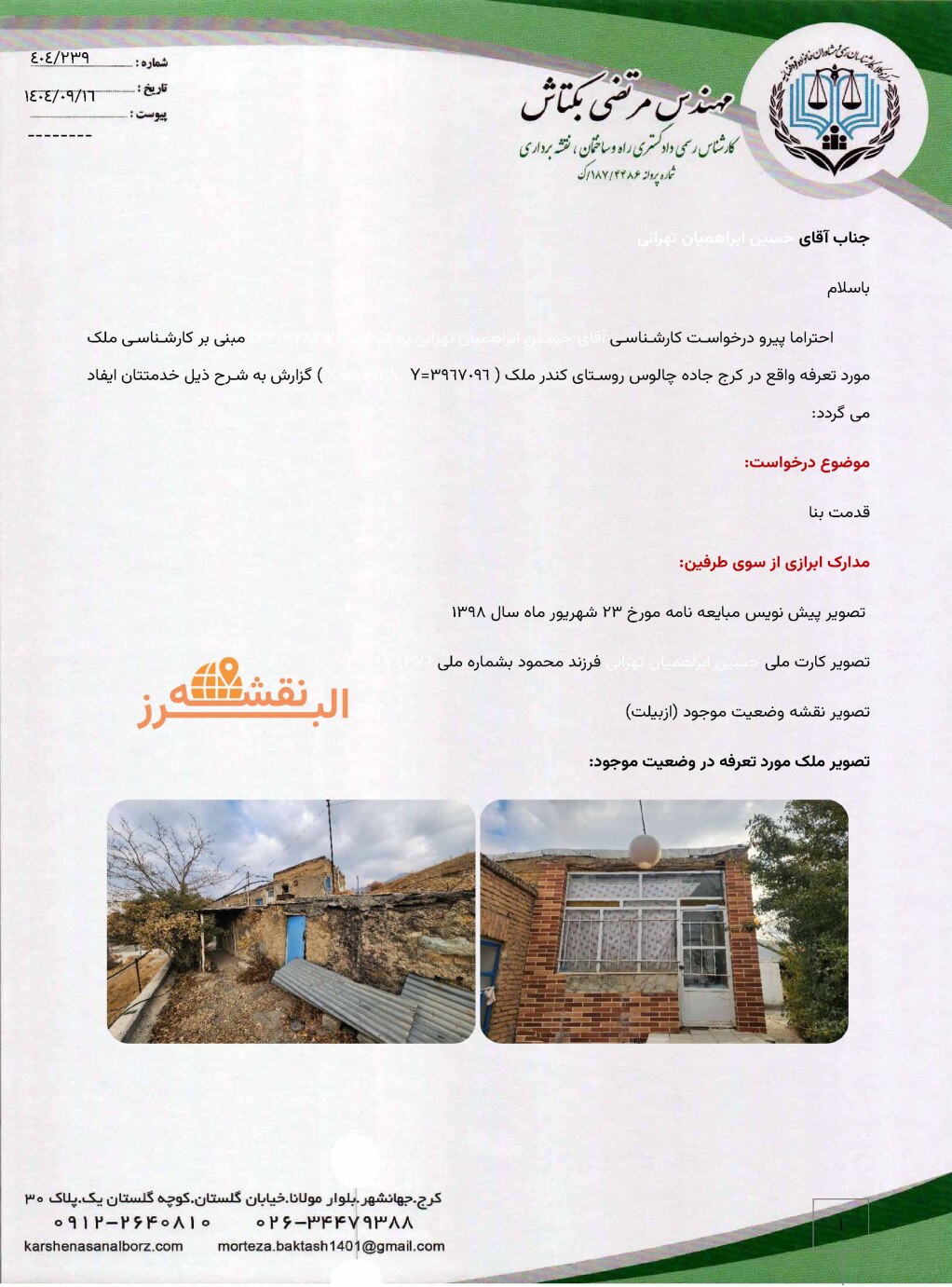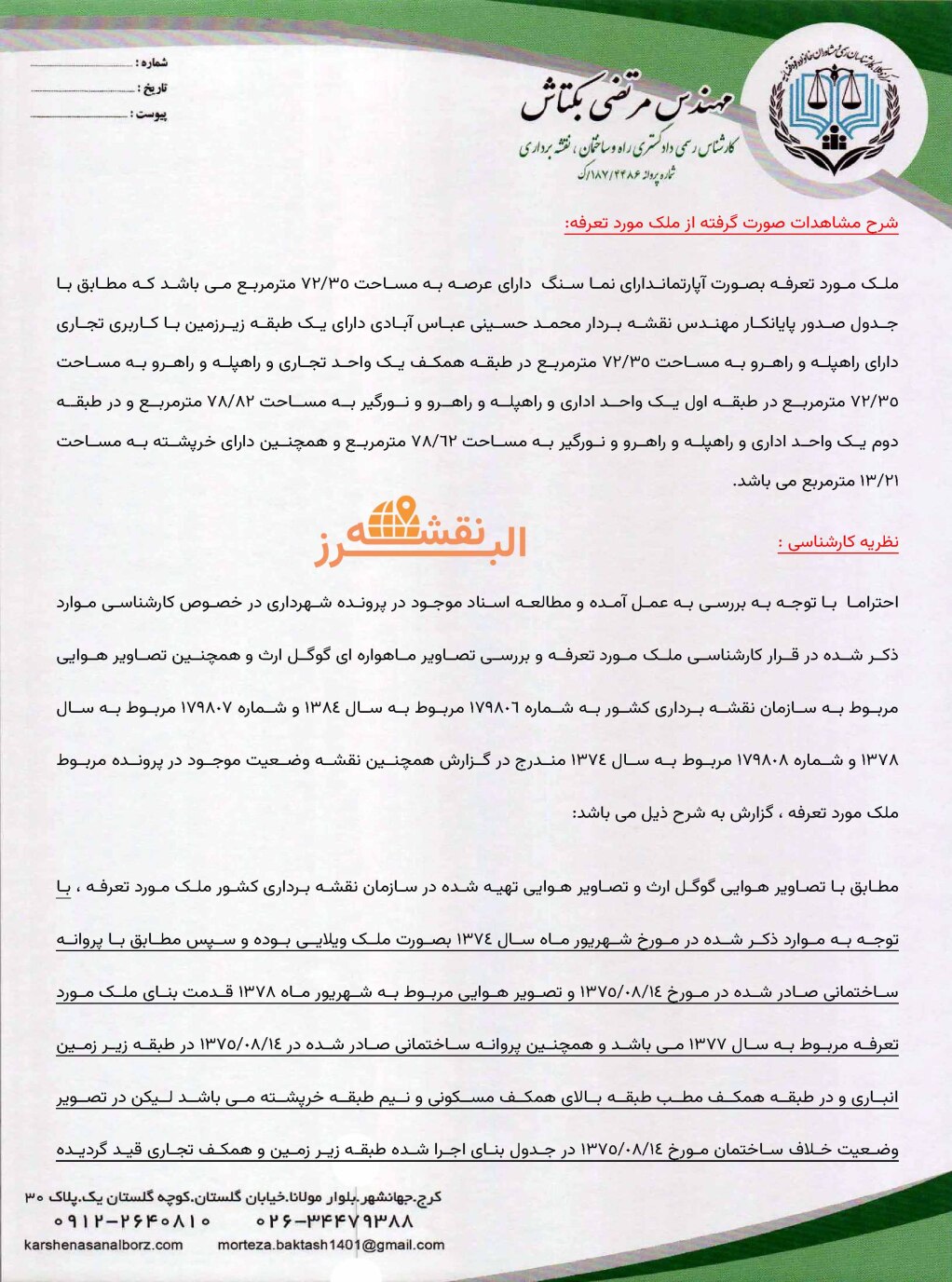 تماس با کارشناس نقشهبرداری (مانند دفتر مهندسی البرز نقشه و مهندس محسن کریمی)