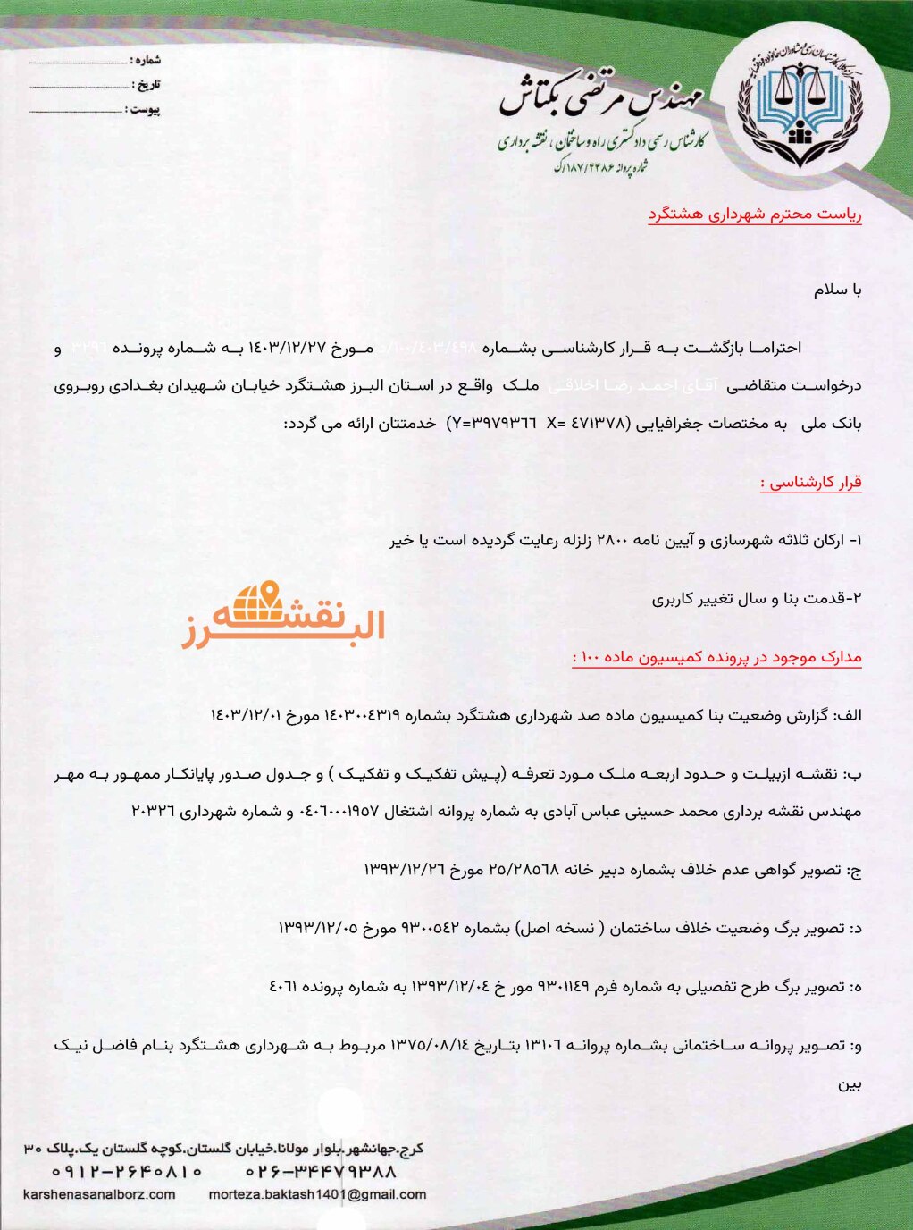 تهیه و ارائه این مستندات توسط کارشناسان رسمی مانند مهندس محسن کریمی و دفتر مهندسی البرز نقشه تضمینکننده صحت و اعتبار مدارک در مراجع اداری و قضایی است.